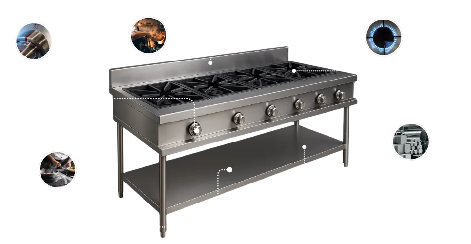 Estufas industriales, campanas, parrillas, mesas y mobiliario en acero inoxidable.